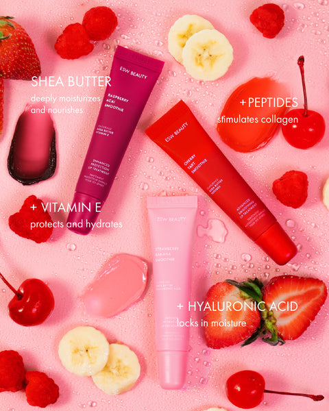 Lip treatments provide a protective layer while simultaneously repairing the moisture barrier for softer, healthier lips. Our treatments vary from clear gloss to tinted treatments and all have their own skin benefits and functions. In addition to our smoothie ingredients, we have added active ingredients such as shea butter, vitamin E, peptides, and hyaluronic acid for long-lasting effects to seal in moisture and nourish the lip.